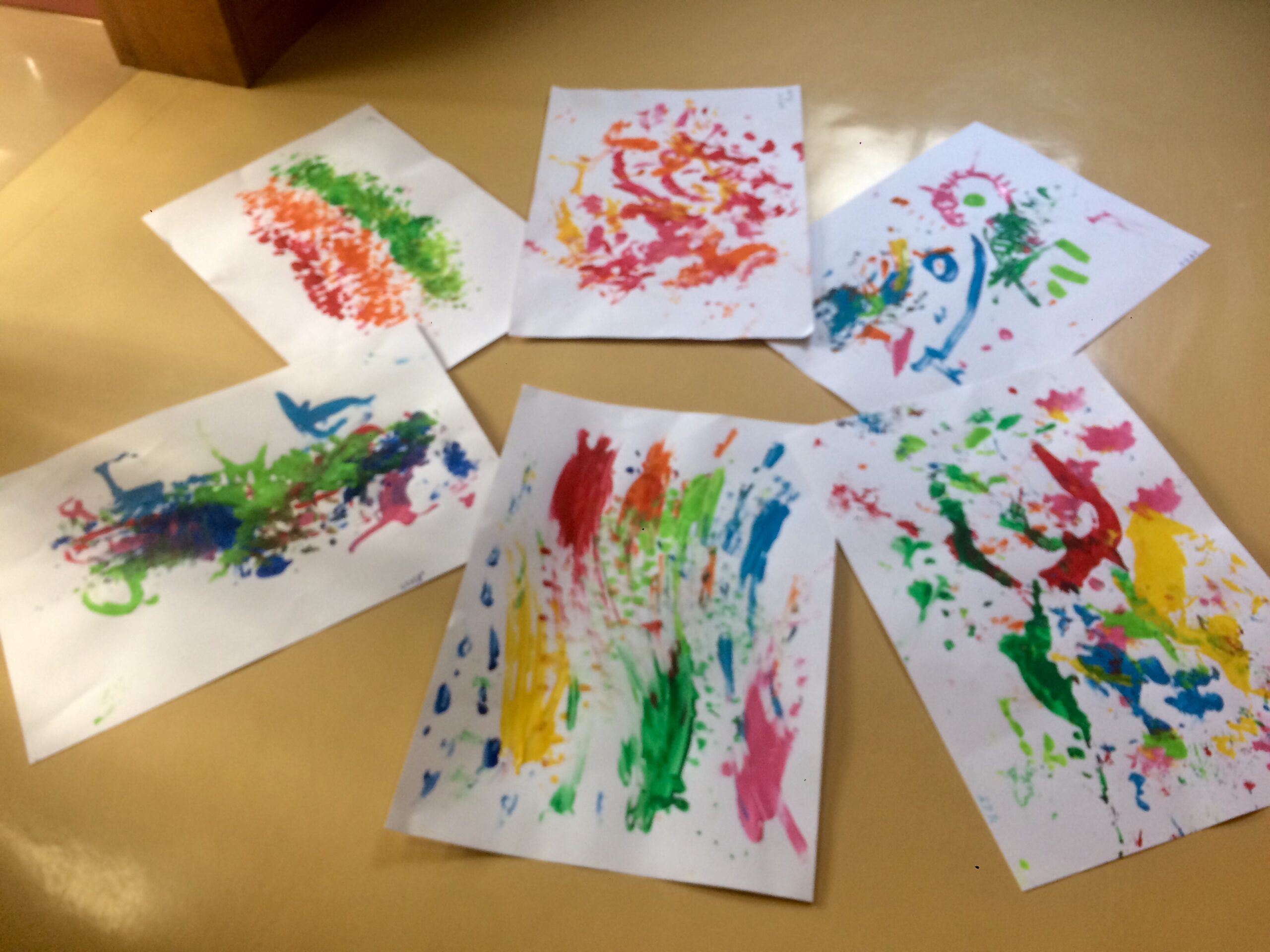 手に絵の具をつけて画用紙上で動かしたり、手を動かせない方は画用紙の方を動かしたりと試行錯誤して完成させました。